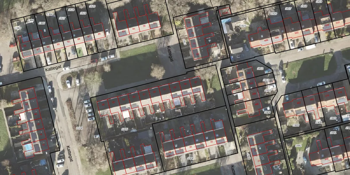 Het perceel waarop Kattegat 63 staat heeft een oppervlakte van 2555 m². Dit is een zeer groot perceel. De perceeloppervlakte wordt geregistreerd door het Kadaster. Gedetailleerde informatie over de maten van dit perceel kunt u vinden in het rapport Kadastrale kaart met maatvoering van Kattegat 63.