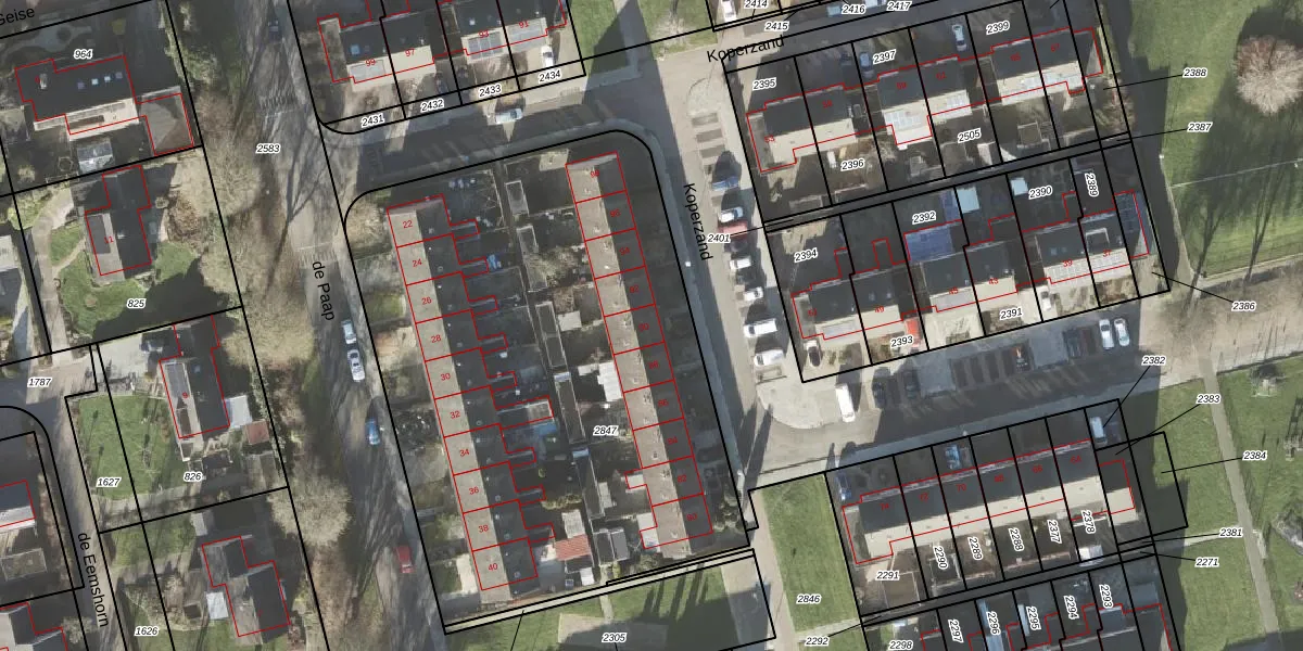 Het perceel waarop Koperzand 90 staat heeft een oppervlakte van 3243 m². Dit is een zeer groot perceel. De perceeloppervlakte wordt geregistreerd door het Kadaster. Gedetailleerde informatie over de maten van dit perceel kunt u vinden in het rapport Kadastrale kaart met maatvoering van Koperzand 90.