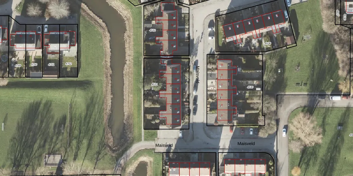 Het perceel waarop Maisveld 24 staat heeft een oppervlakte van 1034 m². Dit is een zeer groot perceel. De perceeloppervlakte wordt geregistreerd door het Kadaster. Gedetailleerde informatie over de maten van dit perceel kunt u vinden in het rapport Kadastrale kaart met maatvoering van Maisveld 24.