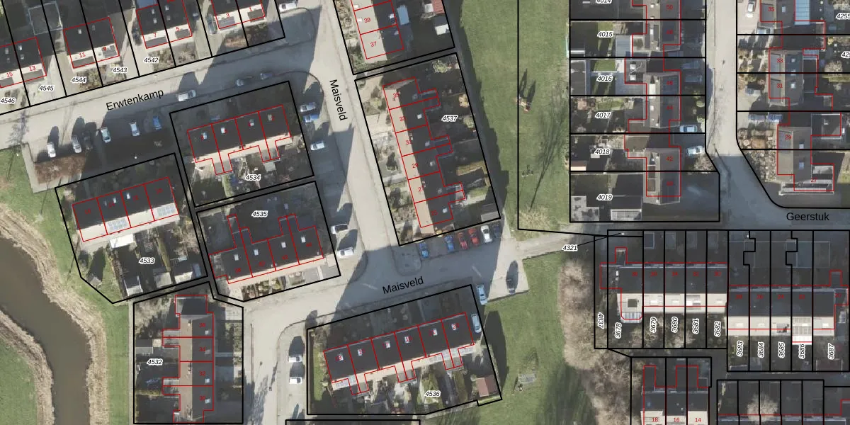 Het perceel waarop Maisveld 25 staat heeft een oppervlakte van 992 m². Dit is een groot perceel. De perceeloppervlakte wordt geregistreerd door het Kadaster. Gedetailleerde informatie over de maten van dit perceel kunt u vinden in het rapport Kadastrale kaart met maatvoering van Maisveld 25.