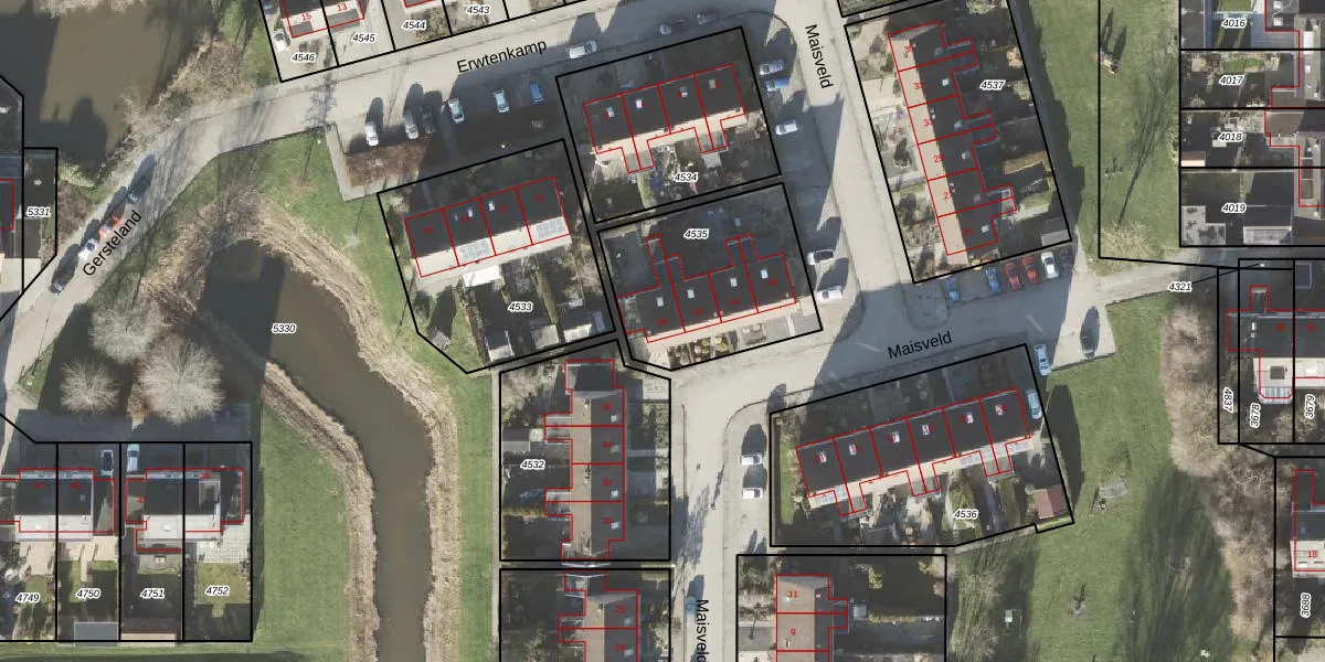 Het perceel waarop Maisveld 38 staat heeft een oppervlakte van 657 m². Dit is een groot perceel. De perceeloppervlakte wordt geregistreerd door het Kadaster. Gedetailleerde informatie over de maten van dit perceel kunt u vinden in het rapport Kadastrale kaart met maatvoering van Maisveld 38.