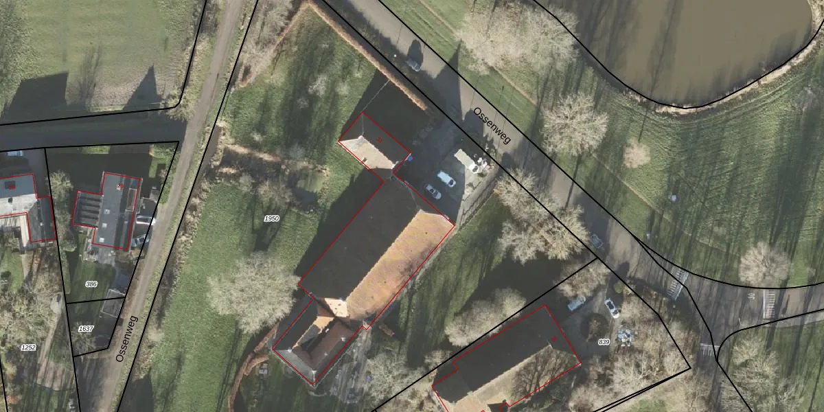 Het perceel waarop Ossenweg 31 staat heeft een oppervlakte van 7565 m². Dit is een zeer groot perceel. De perceeloppervlakte wordt geregistreerd door het Kadaster. Gedetailleerde informatie over de maten van dit perceel kunt u vinden in het rapport Kadastrale kaart met maatvoering van Ossenweg 31.