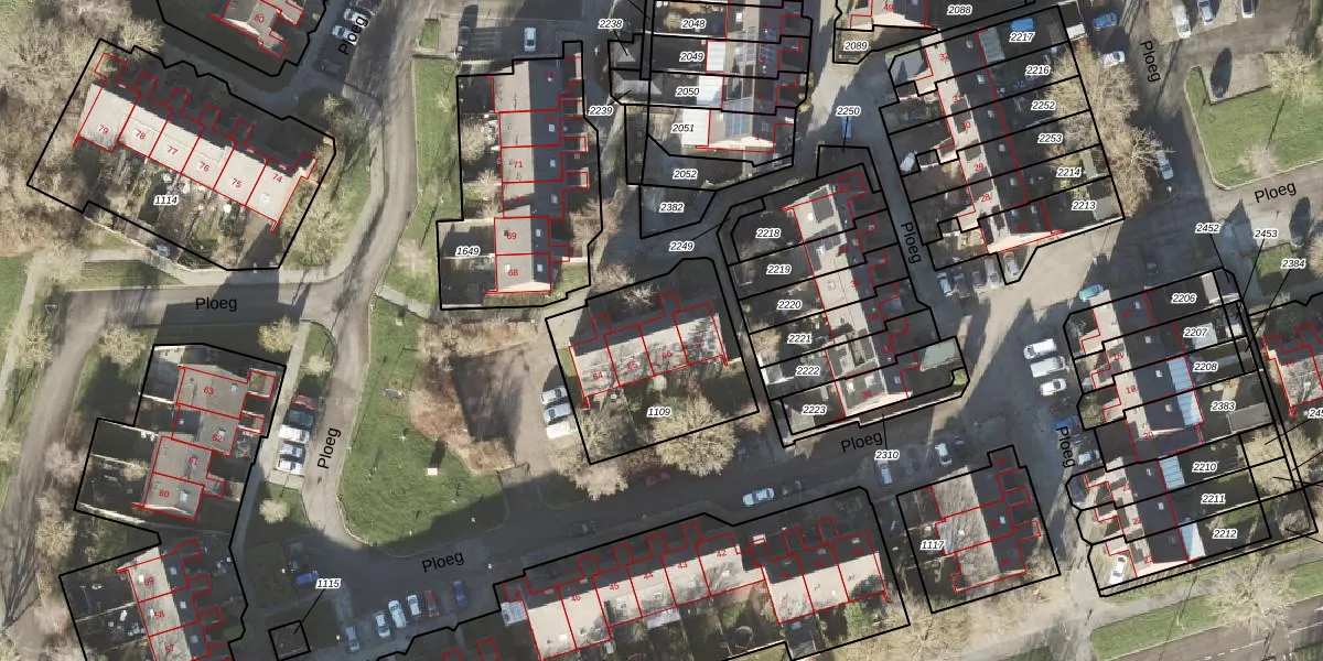 Het perceel waarop Ploeg 66 staat heeft een oppervlakte van 643 m². Dit is een groot perceel. De perceeloppervlakte wordt geregistreerd door het Kadaster. Gedetailleerde informatie over de maten van dit perceel kunt u vinden in het rapport Kadastrale kaart met maatvoering van Ploeg 66.