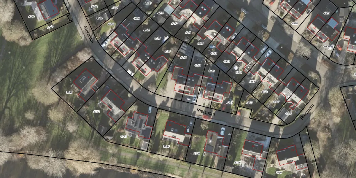 Het perceel waarop Rietzoom 18 staat heeft een oppervlakte van 369 m². Dit is een groot perceel. De perceeloppervlakte wordt geregistreerd door het Kadaster. Gedetailleerde informatie over de maten van dit perceel kunt u vinden in het rapport Kadastrale kaart met maatvoering van Rietzoom 18.