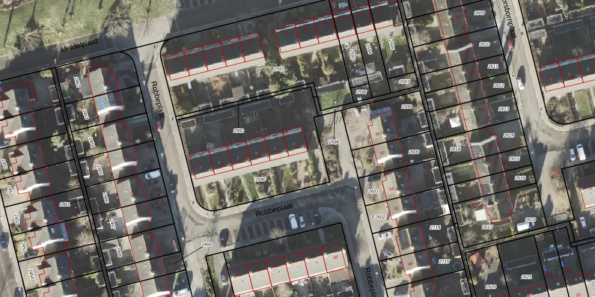 Het perceel waarop Robbeplaat 61 staat heeft een oppervlakte van 1482 m². Dit is een zeer groot perceel. De perceeloppervlakte wordt geregistreerd door het Kadaster. Gedetailleerde informatie over de maten van dit perceel kunt u vinden in het rapport Kadastrale kaart met maatvoering van Robbeplaat 61.