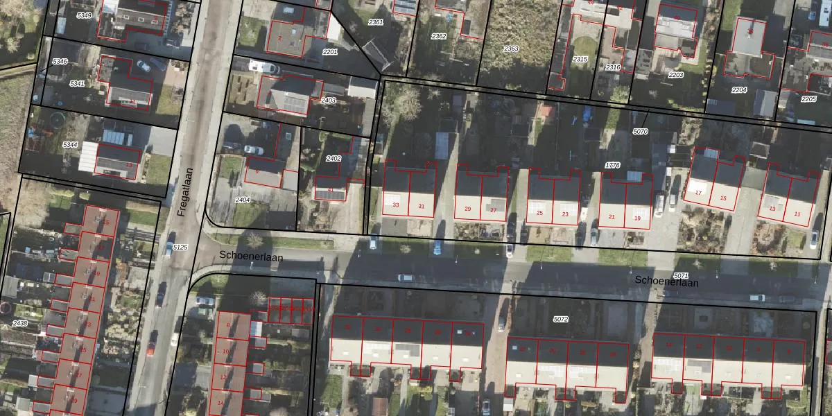 Het perceel waarop Schoenerlaan 31 staat heeft een oppervlakte van 3721 m². Dit is een zeer groot perceel. De perceeloppervlakte wordt geregistreerd door het Kadaster. Gedetailleerde informatie over de maten van dit perceel kunt u vinden in het rapport Kadastrale kaart met maatvoering van Schoenerlaan 31.