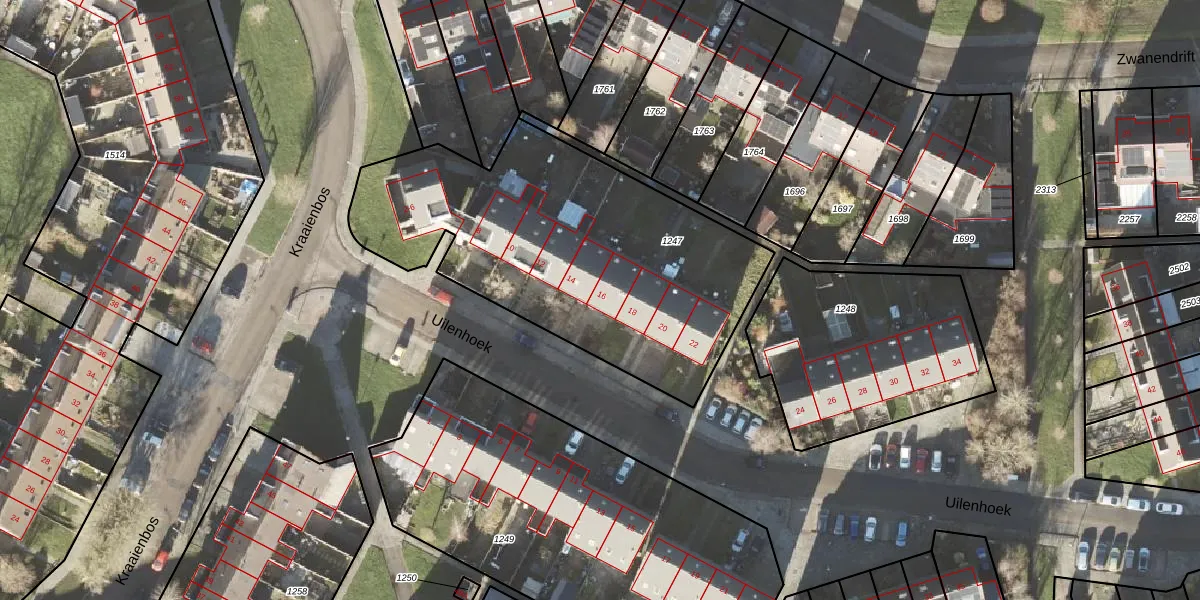 Het perceel waarop Uilenhoek 16 staat heeft een oppervlakte van 1733 m². Dit is een zeer groot perceel. De perceeloppervlakte wordt geregistreerd door het Kadaster. Gedetailleerde informatie over de maten van dit perceel kunt u vinden in het rapport Kadastrale kaart met maatvoering van Uilenhoek 16.