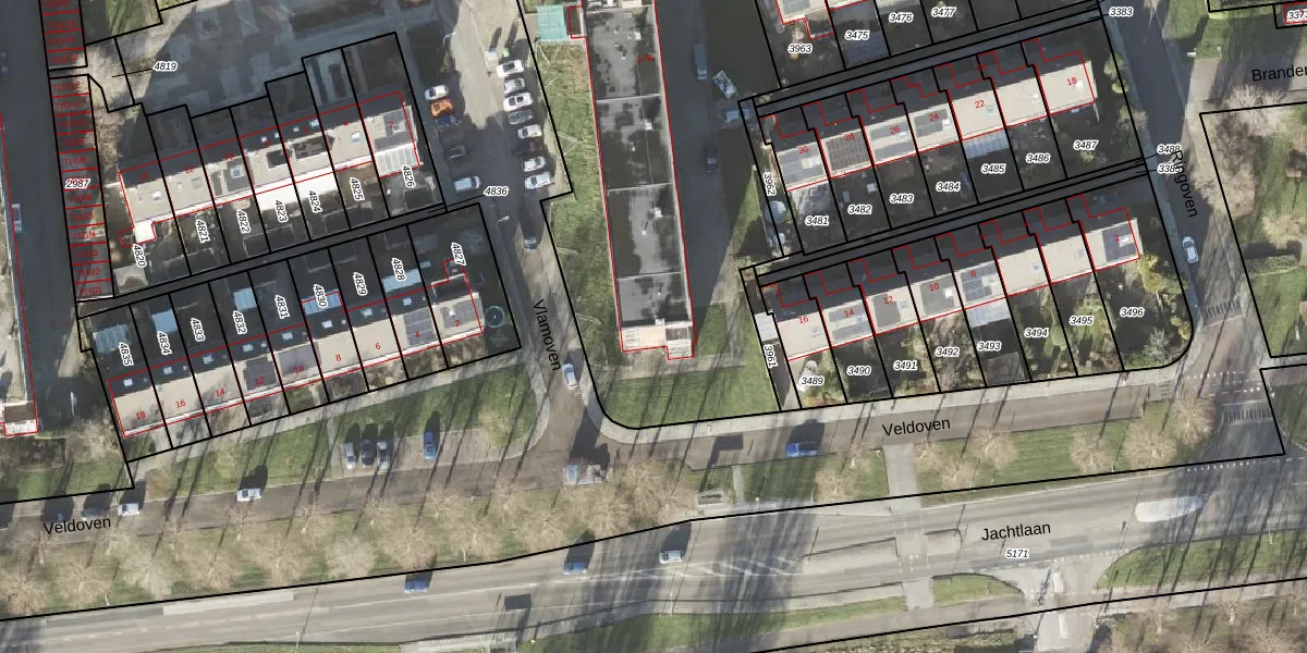 Het perceel waarop Vlamoven 15 staat heeft een oppervlakte van 4397 m². Dit is een zeer groot perceel. De perceeloppervlakte wordt geregistreerd door het Kadaster. Gedetailleerde informatie over de maten van dit perceel kunt u vinden in het rapport Kadastrale kaart met maatvoering van Vlamoven 15.