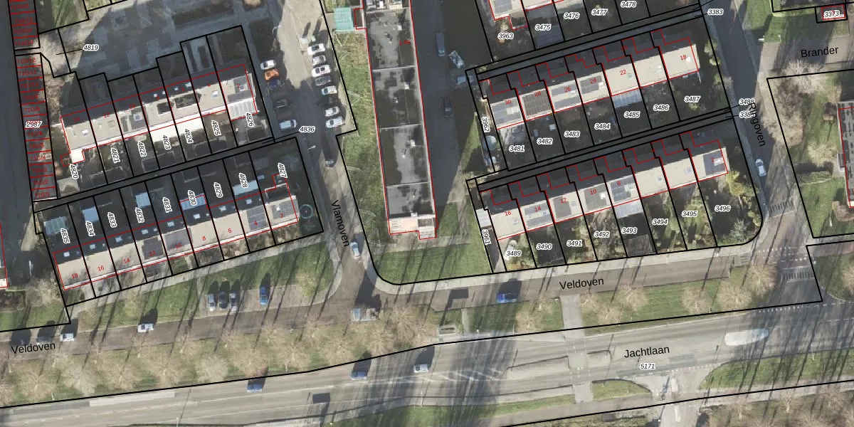 Het perceel waarop Vlamoven 43 staat heeft een oppervlakte van 4397 m². Dit is een zeer groot perceel. De perceeloppervlakte wordt geregistreerd door het Kadaster. Gedetailleerde informatie over de maten van dit perceel kunt u vinden in het rapport Kadastrale kaart met maatvoering van Vlamoven 43.