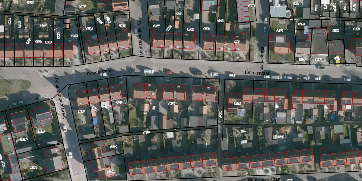 Het perceel waarop Emmastraat 16 staat heeft een oppervlakte van 1425 m². Dit is een zeer groot perceel. De perceeloppervlakte wordt geregistreerd door het Kadaster. Gedetailleerde informatie over de maten van dit perceel kunt u vinden in het rapport Kadastrale kaart met maatvoering van Emmastraat 16.