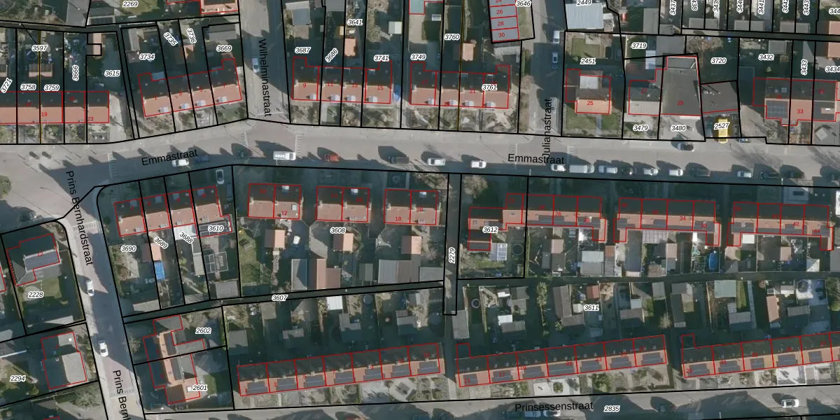 Het perceel waarop Emmastraat 20 staat heeft een oppervlakte van 1425 m². Dit is een zeer groot perceel. De perceeloppervlakte wordt geregistreerd door het Kadaster. Gedetailleerde informatie over de maten van dit perceel kunt u vinden in het rapport Kadastrale kaart met maatvoering van Emmastraat 20.
