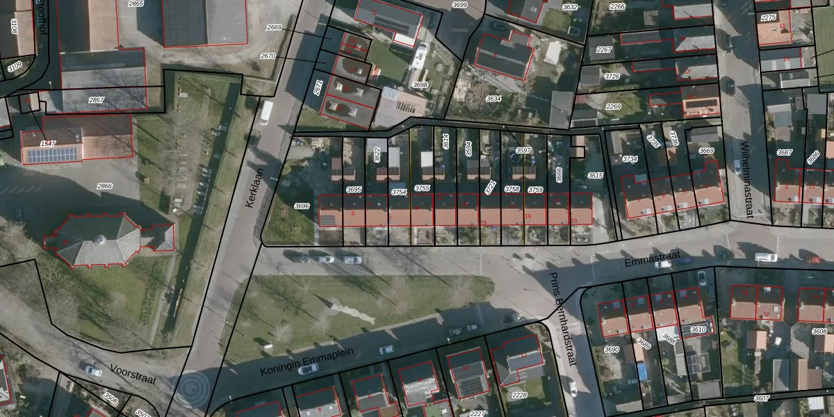 Koningin Emmaplein 9 is gelegen op kadastraal perceel BML03B3755. Deze kadastrale aanduiding is uniek en wordt gebruikt door het Kadaster om eigendomsrechten en andere zakelijke rechten vast te leggen. Het perceel maakt onderdeel uit van de kadastrale gemeente Den Bommel.