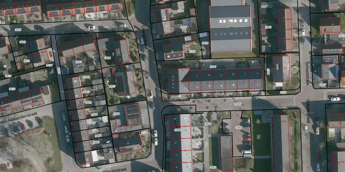 Oranjestraat 13 is gelegen op kadastraal perceel BML03B2606. Deze kadastrale aanduiding is uniek en wordt gebruikt door het Kadaster om eigendomsrechten en andere zakelijke rechten vast te leggen. Het perceel maakt onderdeel uit van de kadastrale gemeente Den Bommel.