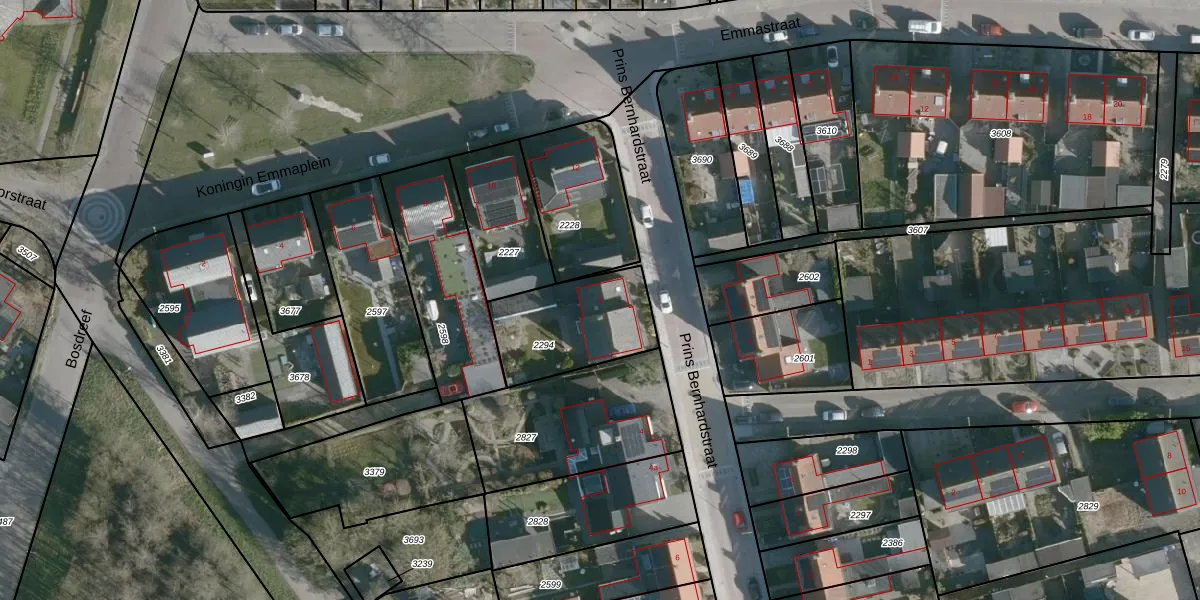 Het perceel waarop Prins Bernhardstraat 2 staat heeft een oppervlakte van 392 m². Dit is een groot perceel. De perceeloppervlakte wordt geregistreerd door het Kadaster. Gedetailleerde informatie over de maten van dit perceel kunt u vinden in het rapport Kadastrale kaart met maatvoering van Prins Bernhardstraat 2.