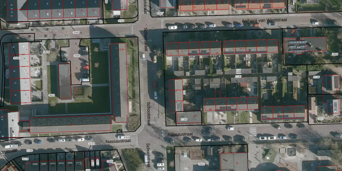 Het perceel waarop Schoolstraat 13 staat heeft een oppervlakte van 4161 m². Dit is een zeer groot perceel. De perceeloppervlakte wordt geregistreerd door het Kadaster. Gedetailleerde informatie over de maten van dit perceel kunt u vinden in het rapport Kadastrale kaart met maatvoering van Schoolstraat 13.
