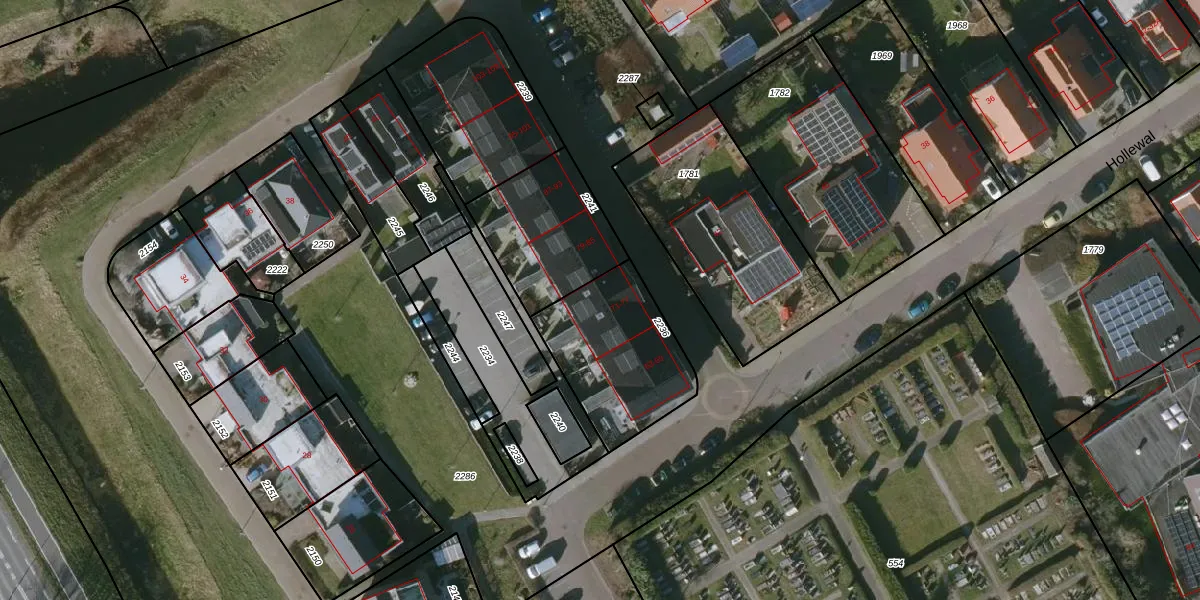 Het perceel waarop Hollewal 75 staat heeft een oppervlakte van 490 m². Dit is een groot perceel. De perceeloppervlakte wordt geregistreerd door het Kadaster. Gedetailleerde informatie over de maten van dit perceel kunt u vinden in het rapport Kadastrale kaart met maatvoering van Hollewal 75.
