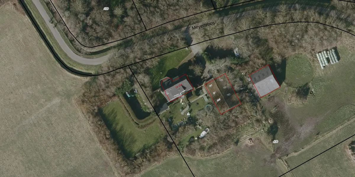 Het perceel waarop Meyertebos 19-A staat heeft een oppervlakte van 1,0 ha. Dit is een zeer groot perceel. De perceeloppervlakte wordt geregistreerd door het Kadaster. Gedetailleerde informatie over de maten van dit perceel kunt u vinden in het rapport Kadastrale kaart met maatvoering van Meyertebos 19-A.