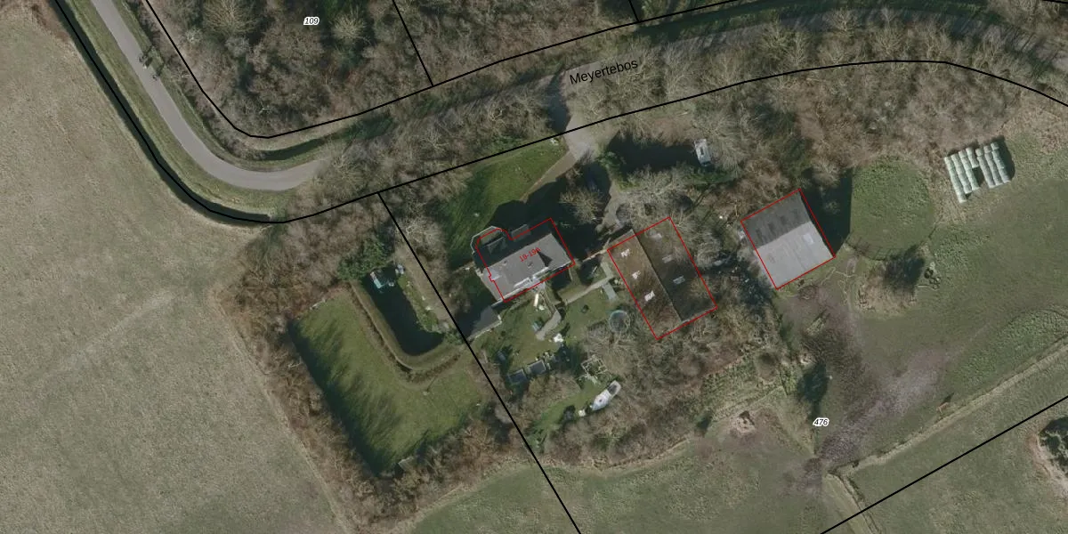 Het perceel waarop Meyertebos 19 staat heeft een oppervlakte van 1,0 ha. Dit is een zeer groot perceel. De perceeloppervlakte wordt geregistreerd door het Kadaster. Gedetailleerde informatie over de maten van dit perceel kunt u vinden in het rapport Kadastrale kaart met maatvoering van Meyertebos 19.