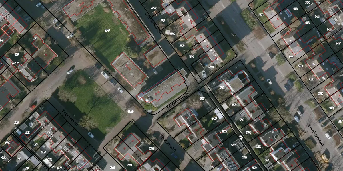 Het perceel waarop Starkenburgh 34 staat heeft een oppervlakte van 5373 m². Dit is een zeer groot perceel. De perceeloppervlakte wordt geregistreerd door het Kadaster. Gedetailleerde informatie over de maten van dit perceel kunt u vinden in het rapport Kadastrale kaart met maatvoering van Starkenburgh 34.