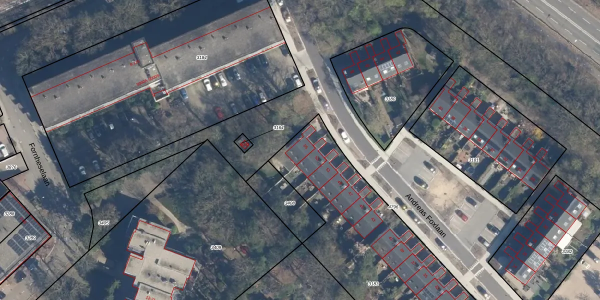 Het perceel waarop Andreas Foxlaan 55 staat heeft een oppervlakte van 2180 m². Dit is een zeer groot perceel. De perceeloppervlakte wordt geregistreerd door het Kadaster. Gedetailleerde informatie over de maten van dit perceel kunt u vinden in het rapport Kadastrale kaart met maatvoering van Andreas Foxlaan 55.
