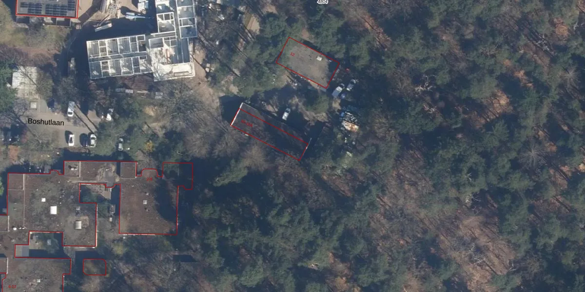Het perceel waarop Boshutlaan 10-A staat heeft een oppervlakte van 13,0 ha. Dit is een zeer groot perceel. De perceeloppervlakte wordt geregistreerd door het Kadaster. Gedetailleerde informatie over de maten van dit perceel kunt u vinden in het rapport Kadastrale kaart met maatvoering van Boshutlaan 10-A.