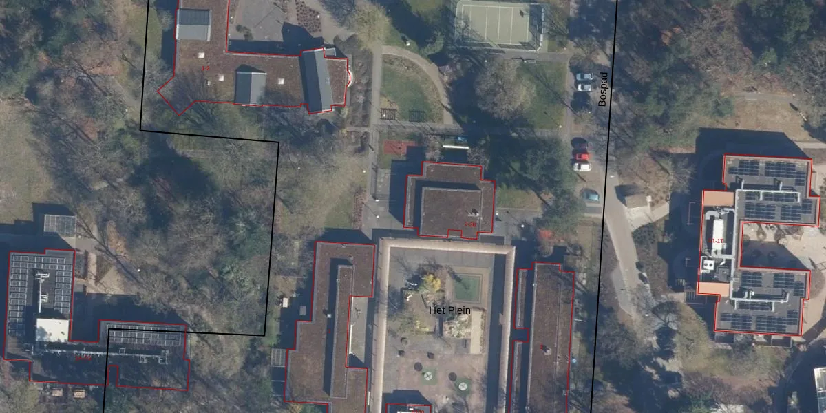 Het perceel waarop Het Plein 2 staat heeft een oppervlakte van 3,0 ha. Dit is een zeer groot perceel. De perceeloppervlakte wordt geregistreerd door het Kadaster. Gedetailleerde informatie over de maten van dit perceel kunt u vinden in het rapport Kadastrale kaart met maatvoering van Het Plein 2.