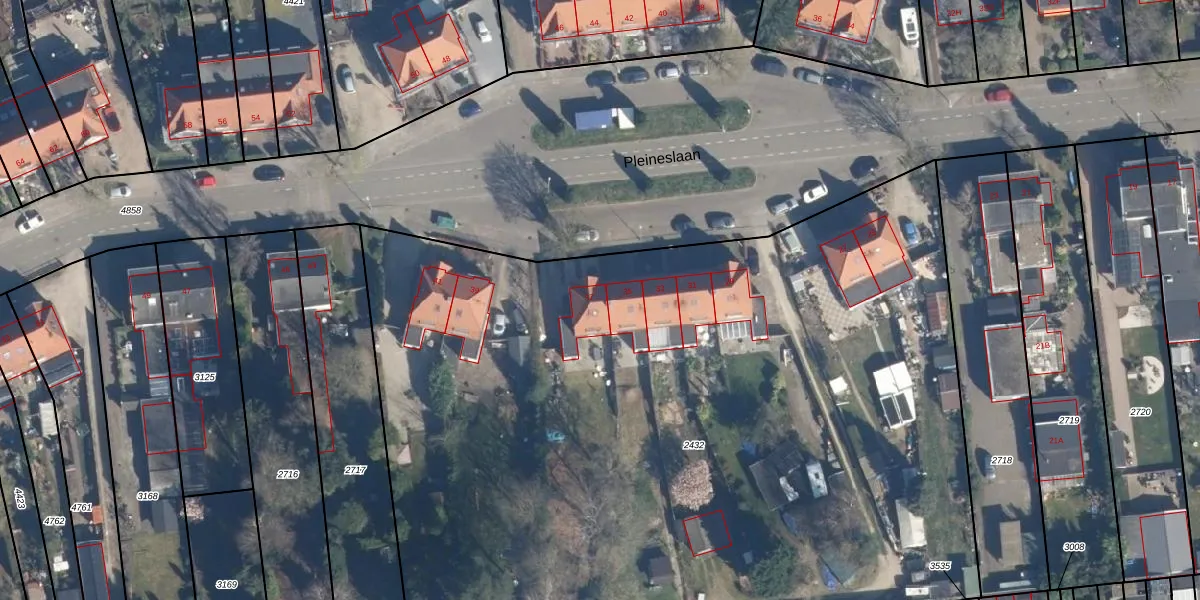 Het perceel waarop Pleineslaan 37 staat heeft een oppervlakte van 6400 m². Dit is een zeer groot perceel. De perceeloppervlakte wordt geregistreerd door het Kadaster. Gedetailleerde informatie over de maten van dit perceel kunt u vinden in het rapport Kadastrale kaart met maatvoering van Pleineslaan 37.
