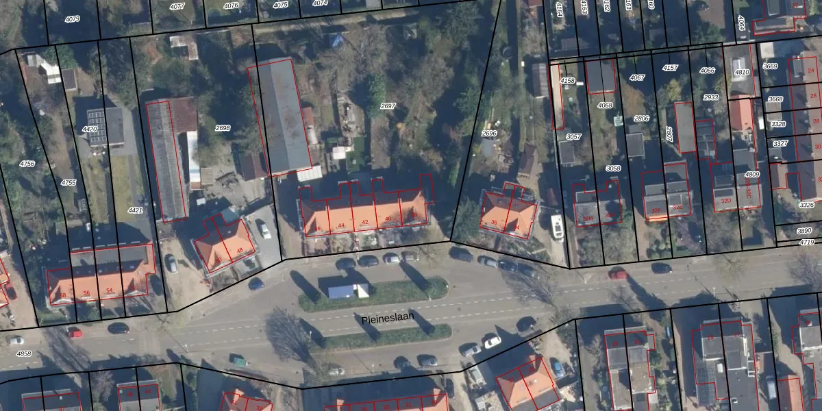 Het perceel waarop Pleineslaan 38 staat heeft een oppervlakte van 2960 m². Dit is een zeer groot perceel. De perceeloppervlakte wordt geregistreerd door het Kadaster. Gedetailleerde informatie over de maten van dit perceel kunt u vinden in het rapport Kadastrale kaart met maatvoering van Pleineslaan 38.