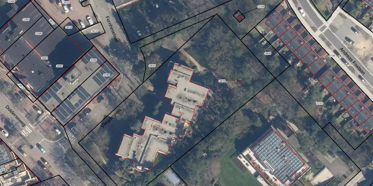Het perceel waarop Vliegdennen 19 staat heeft een oppervlakte van 4410 m². Dit is een zeer groot perceel. De perceeloppervlakte wordt geregistreerd door het Kadaster. Gedetailleerde informatie over de maten van dit perceel kunt u vinden in het rapport Kadastrale kaart met maatvoering van Vliegdennen 19.