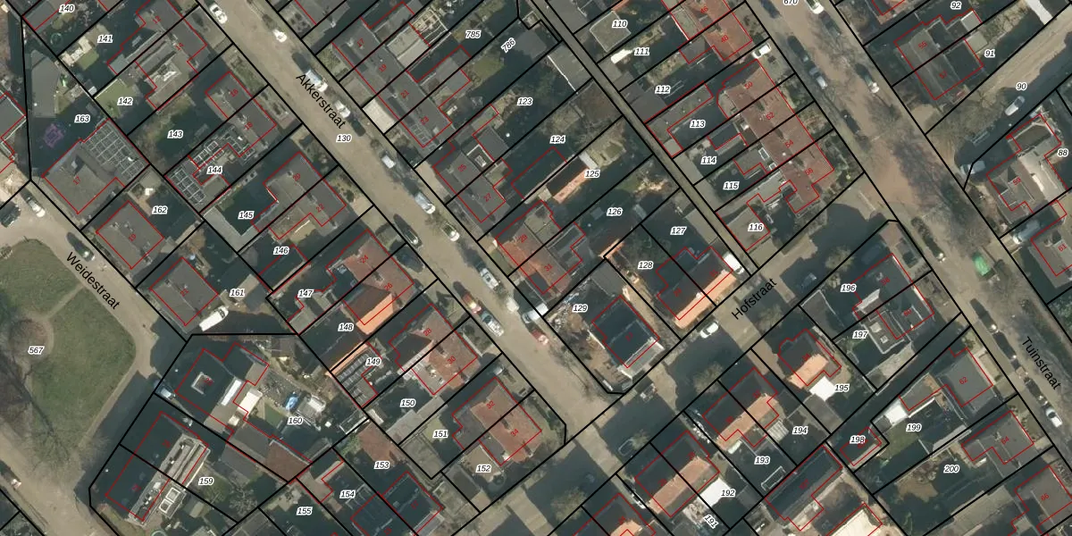 Het perceel waarop Akkerstraat 31 staat heeft een oppervlakte van 323 m². Dit is een groot perceel. De perceeloppervlakte wordt geregistreerd door het Kadaster. Gedetailleerde informatie over de maten van dit perceel kunt u vinden in het rapport Kadastrale kaart met maatvoering van Akkerstraat 31.