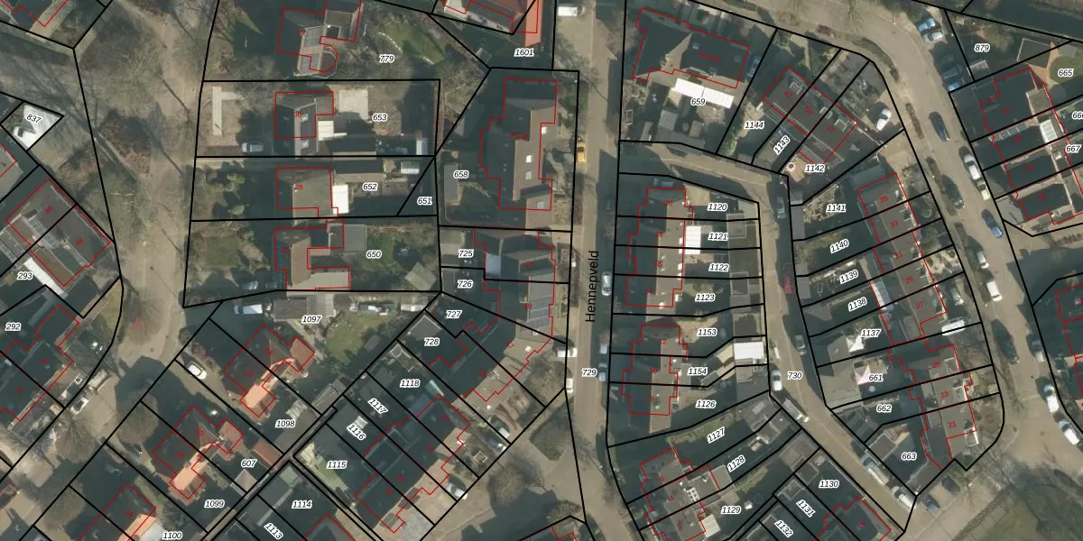 Hennepveld 21 is gelegen op kadastraal perceel DGN02E725. Deze kadastrale aanduiding is uniek en wordt gebruikt door het Kadaster om eigendomsrechten en andere zakelijke rechten vast te leggen. Het perceel maakt onderdeel uit van de kadastrale gemeente Den Dungen.