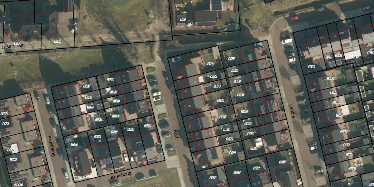 Het perceel waarop Korf 12 staat heeft een oppervlakte van 150 m². Dit is een middelgroot perceel. De perceeloppervlakte wordt geregistreerd door het Kadaster. Gedetailleerde informatie over de maten van dit perceel kunt u vinden in het rapport Kadastrale kaart met maatvoering van Korf 12.