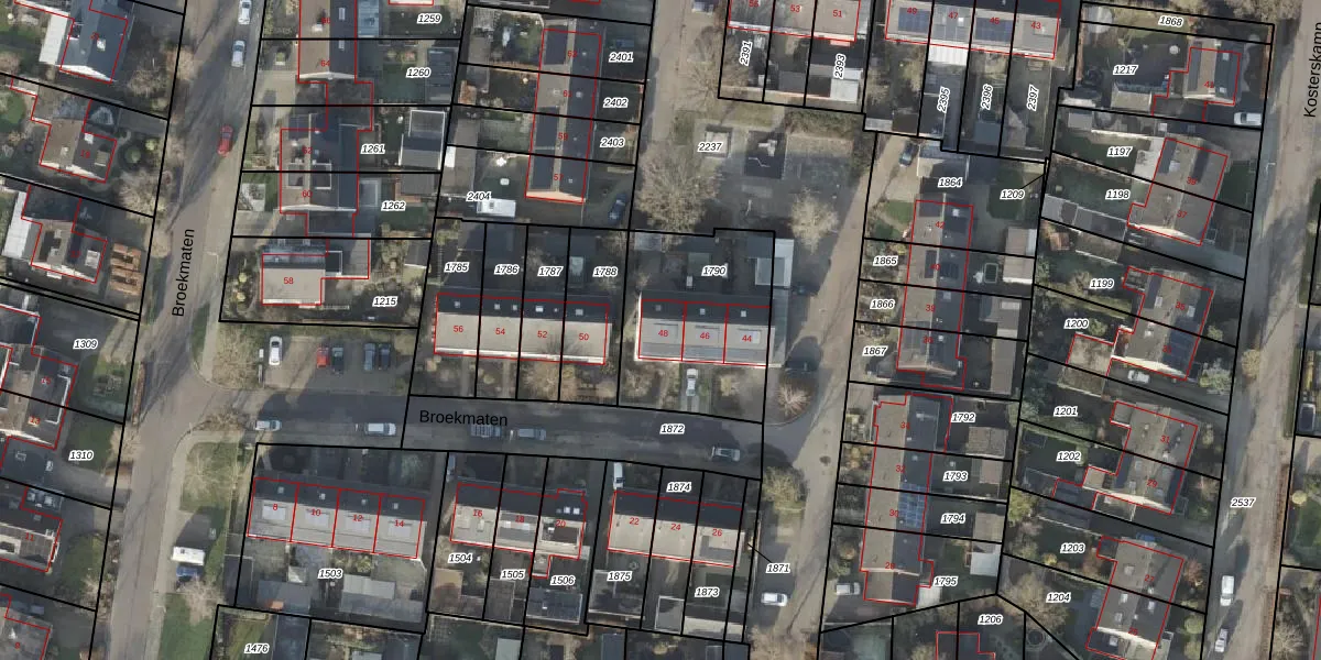 Het perceel waarop Broekmaten 48 staat heeft een oppervlakte van 598 m². Dit is een groot perceel. De perceeloppervlakte wordt geregistreerd door het Kadaster. Gedetailleerde informatie over de maten van dit perceel kunt u vinden in het rapport Kadastrale kaart met maatvoering van Broekmaten 48.