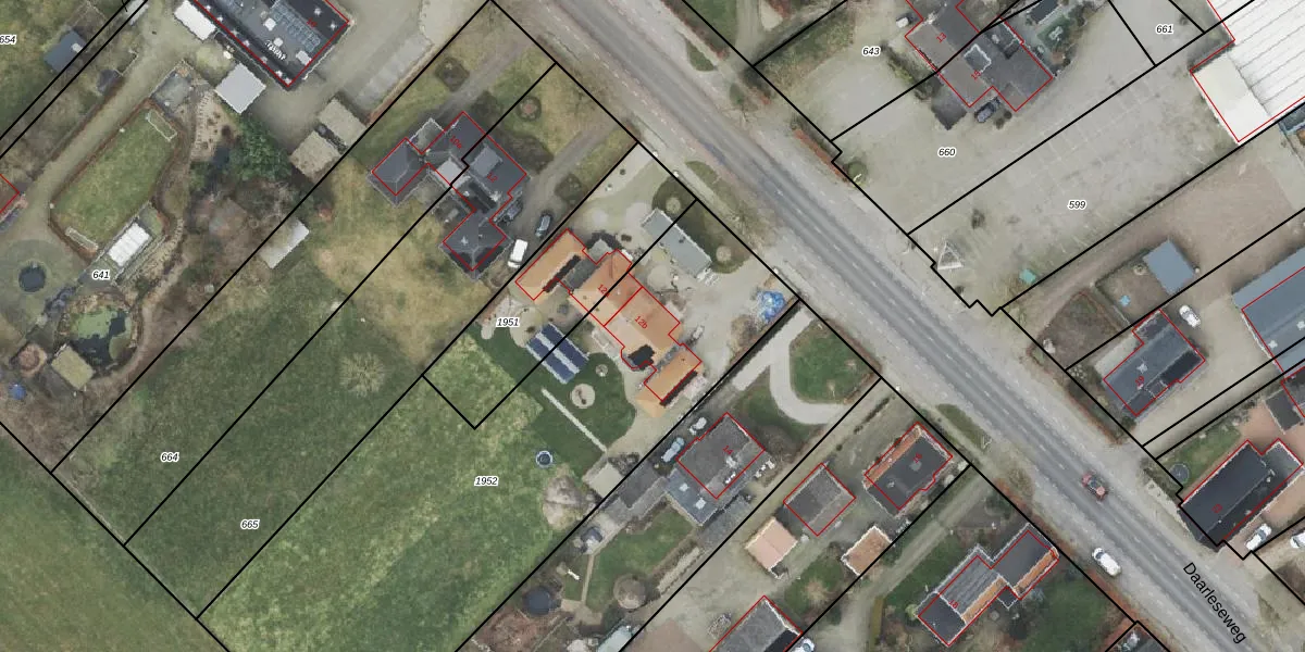 Het perceel waarop Daarleseweg 12-b staat heeft een oppervlakte van 2730 m². Dit is een zeer groot perceel. De perceeloppervlakte wordt geregistreerd door het Kadaster. Gedetailleerde informatie over de maten van dit perceel kunt u vinden in het rapport Kadastrale kaart met maatvoering van Daarleseweg 12-b.