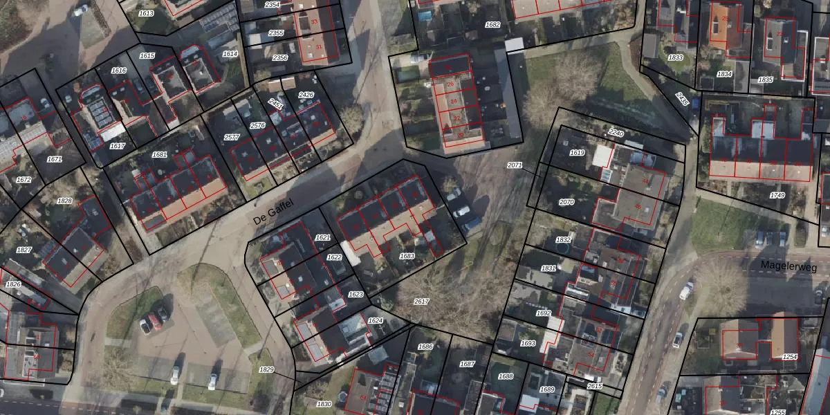 Het perceel waarop De Gaffel 18 staat heeft een oppervlakte van 656 m². Dit is een groot perceel. De perceeloppervlakte wordt geregistreerd door het Kadaster. Gedetailleerde informatie over de maten van dit perceel kunt u vinden in het rapport Kadastrale kaart met maatvoering van De Gaffel 18.
