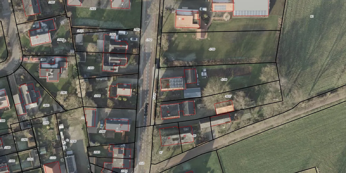 Esweg 34 is gelegen op kadastraal perceel HAM00A4798. Deze kadastrale aanduiding is uniek en wordt gebruikt door het Kadaster om eigendomsrechten en andere zakelijke rechten vast te leggen. Het perceel maakt onderdeel uit van de kadastrale gemeente Den Ham.