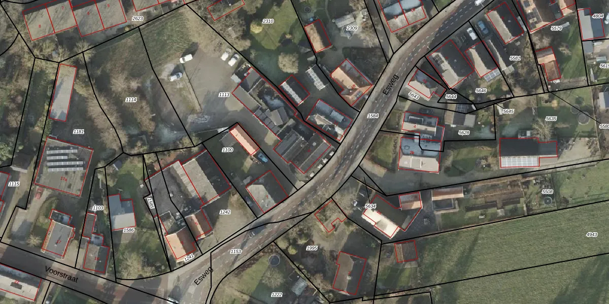 Het perceel waarop Esweg 9 staat heeft een oppervlakte van 1640 m². Dit is een zeer groot perceel. De perceeloppervlakte wordt geregistreerd door het Kadaster. Gedetailleerde informatie over de maten van dit perceel kunt u vinden in het rapport Kadastrale kaart met maatvoering van Esweg 9.