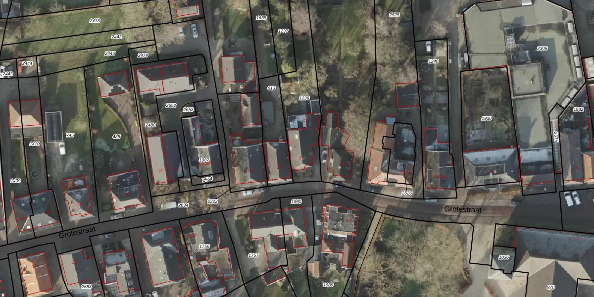 Het perceel waarop Grotestraat 20 staat heeft een oppervlakte van 614 m². Dit is een groot perceel. De perceeloppervlakte wordt geregistreerd door het Kadaster. Gedetailleerde informatie over de maten van dit perceel kunt u vinden in het rapport Kadastrale kaart met maatvoering van Grotestraat 20.