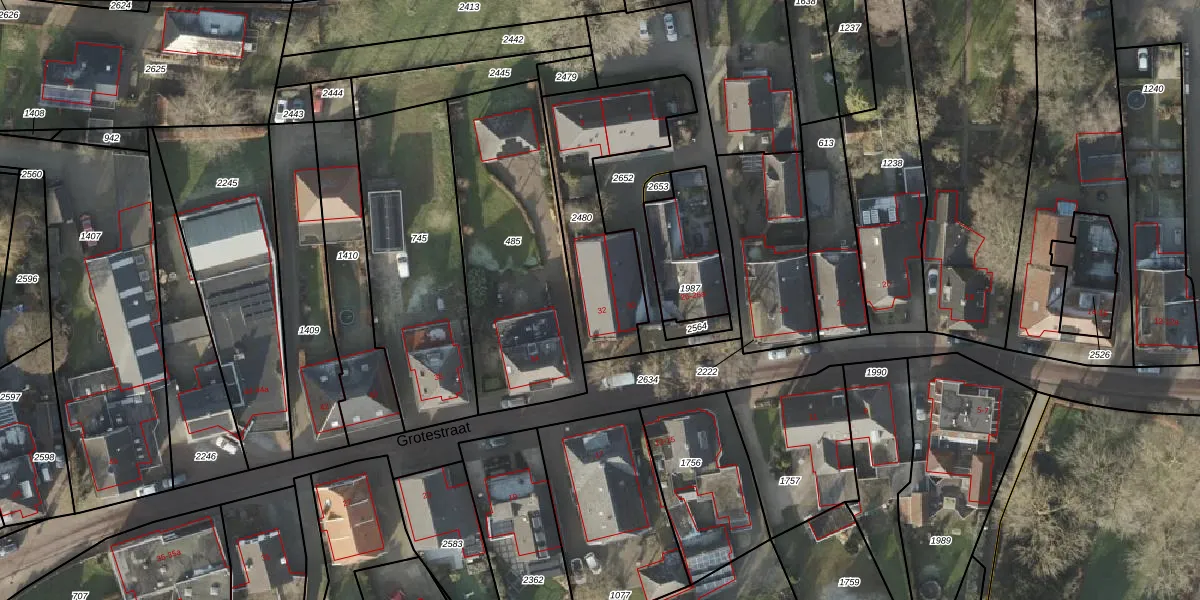 Het perceel waarop Grotestraat 32 staat heeft een oppervlakte van 583 m². Dit is een groot perceel. De perceeloppervlakte wordt geregistreerd door het Kadaster. Gedetailleerde informatie over de maten van dit perceel kunt u vinden in het rapport Kadastrale kaart met maatvoering van Grotestraat 32.