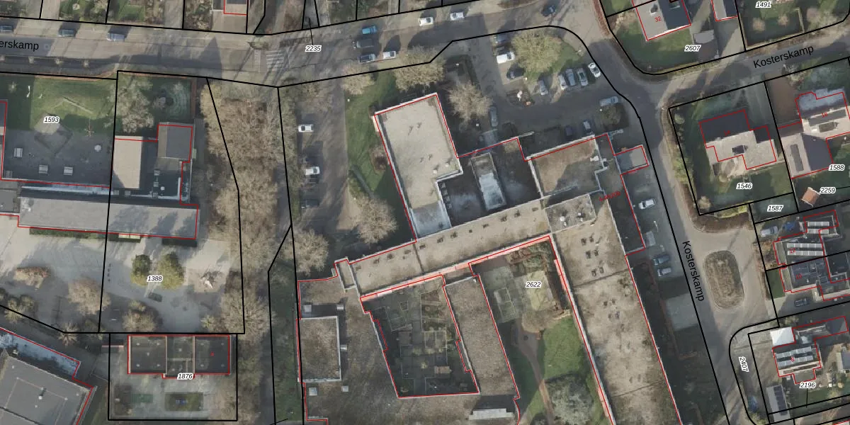 Kosterskamp 4-k107 is gelegen op kadastraal perceel HAM00D2622. Deze kadastrale aanduiding is uniek en wordt gebruikt door het Kadaster om eigendomsrechten en andere zakelijke rechten vast te leggen. Het perceel maakt onderdeel uit van de kadastrale gemeente Den Ham.