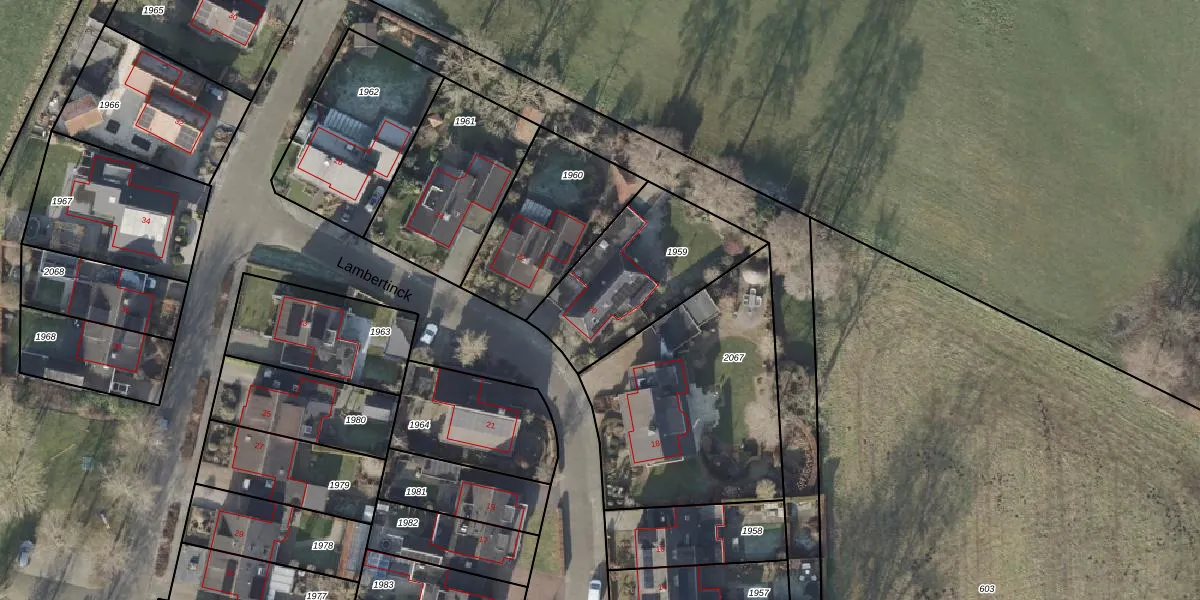 Lambertinck 20 is gelegen op kadastraal perceel HAM00D1959. Deze kadastrale aanduiding is uniek en wordt gebruikt door het Kadaster om eigendomsrechten en andere zakelijke rechten vast te leggen. Het perceel maakt onderdeel uit van de kadastrale gemeente Den Ham.