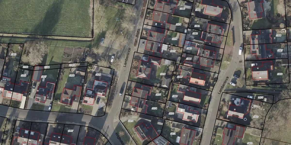 Lambertinck 33 is gelegen op kadastraal perceel HAM00D1976. Deze kadastrale aanduiding is uniek en wordt gebruikt door het Kadaster om eigendomsrechten en andere zakelijke rechten vast te leggen. Het perceel maakt onderdeel uit van de kadastrale gemeente Den Ham.