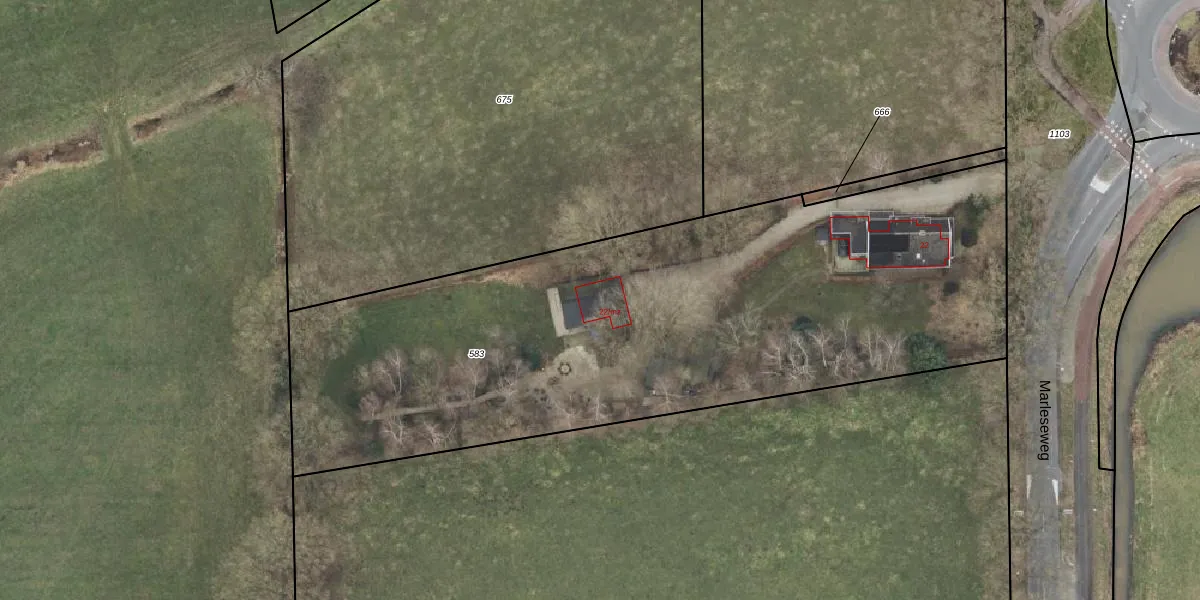 Het perceel waarop Marleseweg 22-mz staat heeft een oppervlakte van 3675 m². Dit is een zeer groot perceel. De perceeloppervlakte wordt geregistreerd door het Kadaster. Gedetailleerde informatie over de maten van dit perceel kunt u vinden in het rapport Kadastrale kaart met maatvoering van Marleseweg 22-mz.