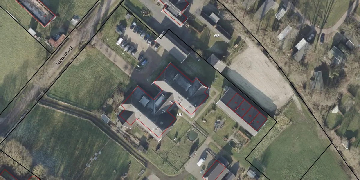 Het perceel waarop Nienenhoek 4 staat heeft een oppervlakte van 2,4 ha. Dit is een zeer groot perceel. De perceeloppervlakte wordt geregistreerd door het Kadaster. Gedetailleerde informatie over de maten van dit perceel kunt u vinden in het rapport Kadastrale kaart met maatvoering van Nienenhoek 4.
