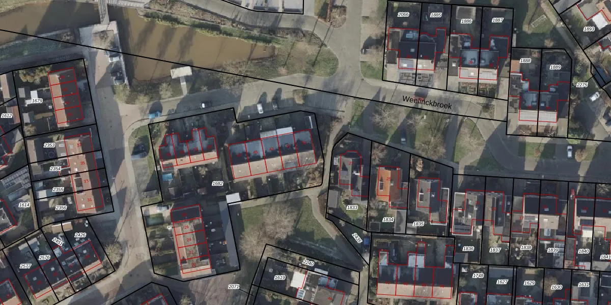 Het perceel waarop Weelinckbroek 39 staat heeft een oppervlakte van 2136 m². Dit is een zeer groot perceel. De perceeloppervlakte wordt geregistreerd door het Kadaster. Gedetailleerde informatie over de maten van dit perceel kunt u vinden in het rapport Kadastrale kaart met maatvoering van Weelinckbroek 39.