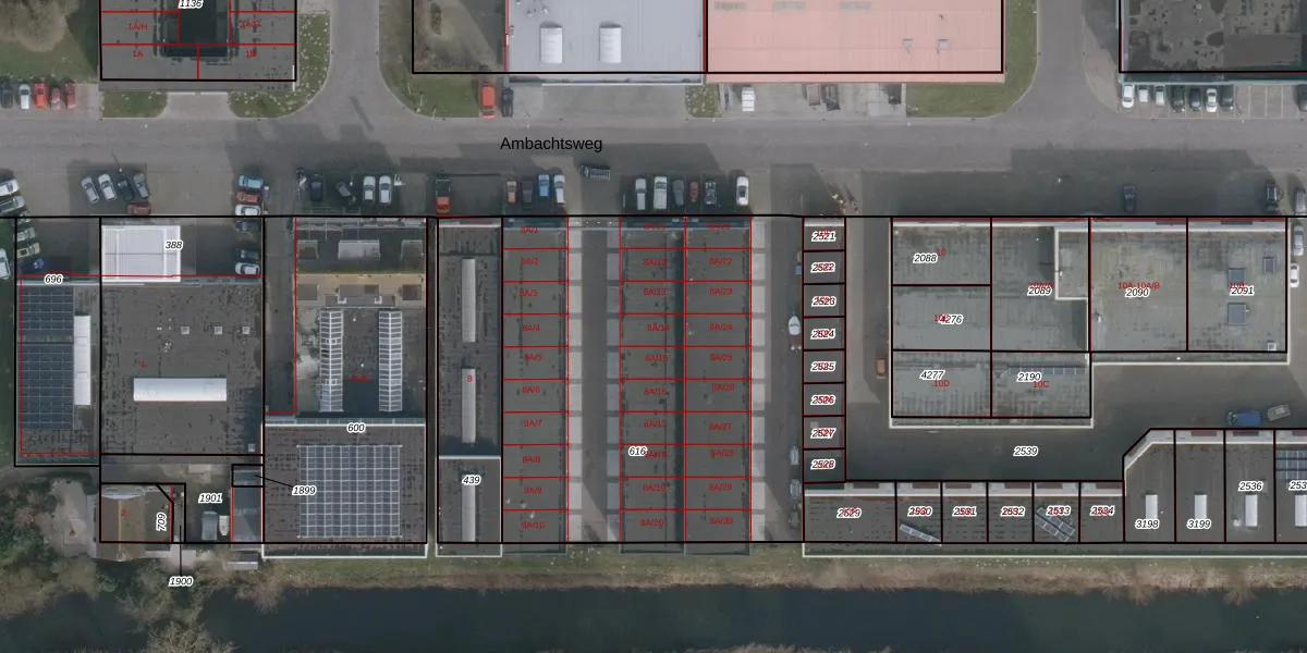 Het perceel waarop Ambachtsweg 8-A-14 staat heeft een oppervlakte van 2300 m². Dit is een zeer groot perceel. De perceeloppervlakte wordt geregistreerd door het Kadaster. Gedetailleerde informatie over de maten van dit perceel kunt u vinden in het rapport Kadastrale kaart met maatvoering van Ambachtsweg 8-A-14.