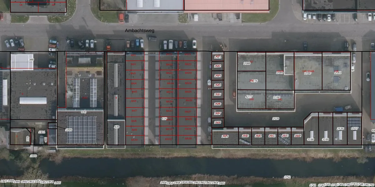 Het perceel waarop Ambachtsweg 8-A-25 staat heeft een oppervlakte van 2300 m². Dit is een zeer groot perceel. De perceeloppervlakte wordt geregistreerd door het Kadaster. Gedetailleerde informatie over de maten van dit perceel kunt u vinden in het rapport Kadastrale kaart met maatvoering van Ambachtsweg 8-A-25.