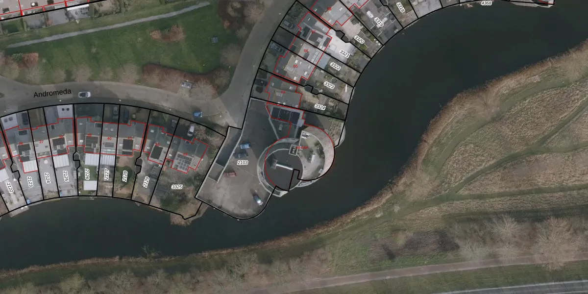 Het perceel waarop Andromeda 48 staat heeft een oppervlakte van 1205 m². Dit is een zeer groot perceel. De perceeloppervlakte wordt geregistreerd door het Kadaster. Gedetailleerde informatie over de maten van dit perceel kunt u vinden in het rapport Kadastrale kaart met maatvoering van Andromeda 48.