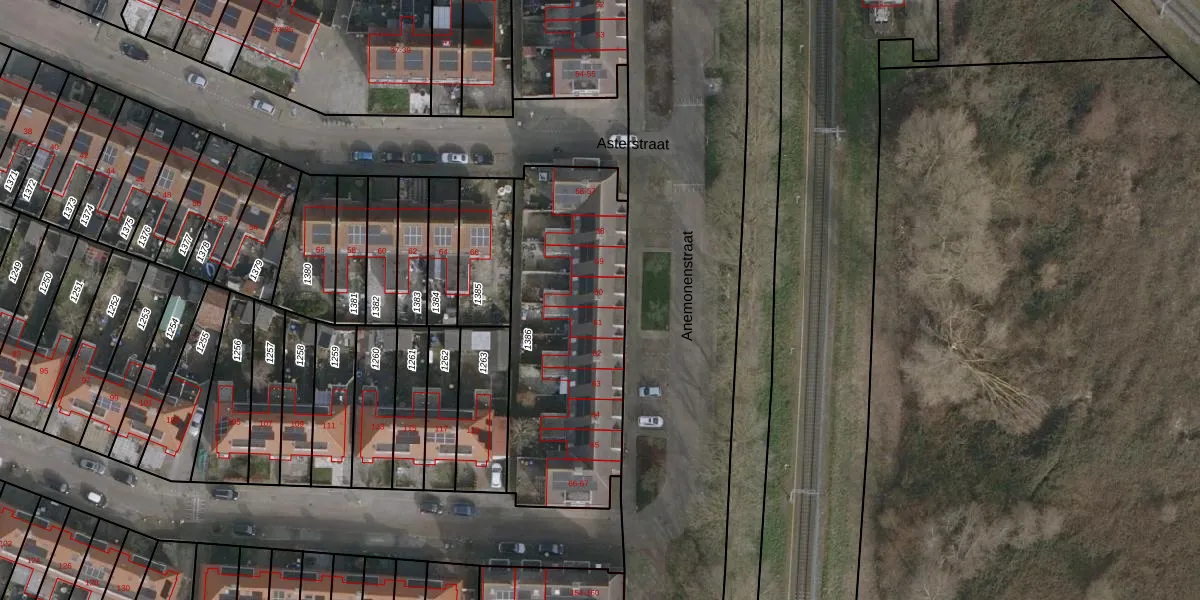 Het perceel waarop Anemonenstraat 60 staat heeft een oppervlakte van 1065 m². Dit is een zeer groot perceel. De perceeloppervlakte wordt geregistreerd door het Kadaster. Gedetailleerde informatie over de maten van dit perceel kunt u vinden in het rapport Kadastrale kaart met maatvoering van Anemonenstraat 60.