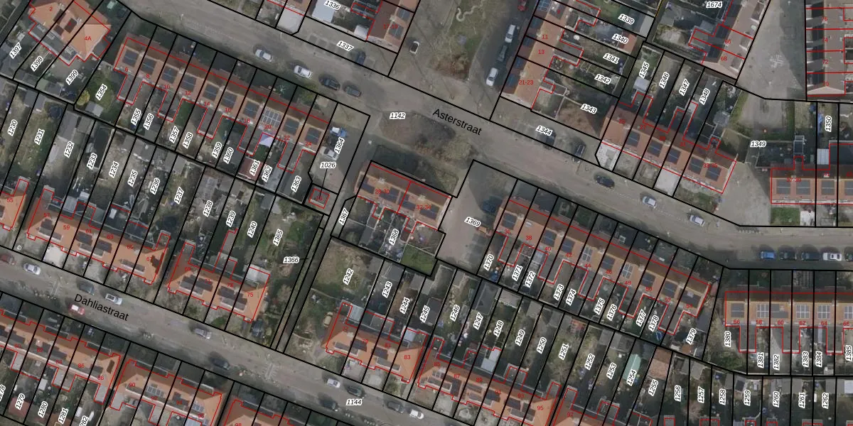 Het perceel waarop Asterstraat 34 staat heeft een oppervlakte van 435 m². Dit is een groot perceel. De perceeloppervlakte wordt geregistreerd door het Kadaster. Gedetailleerde informatie over de maten van dit perceel kunt u vinden in het rapport Kadastrale kaart met maatvoering van Asterstraat 34.